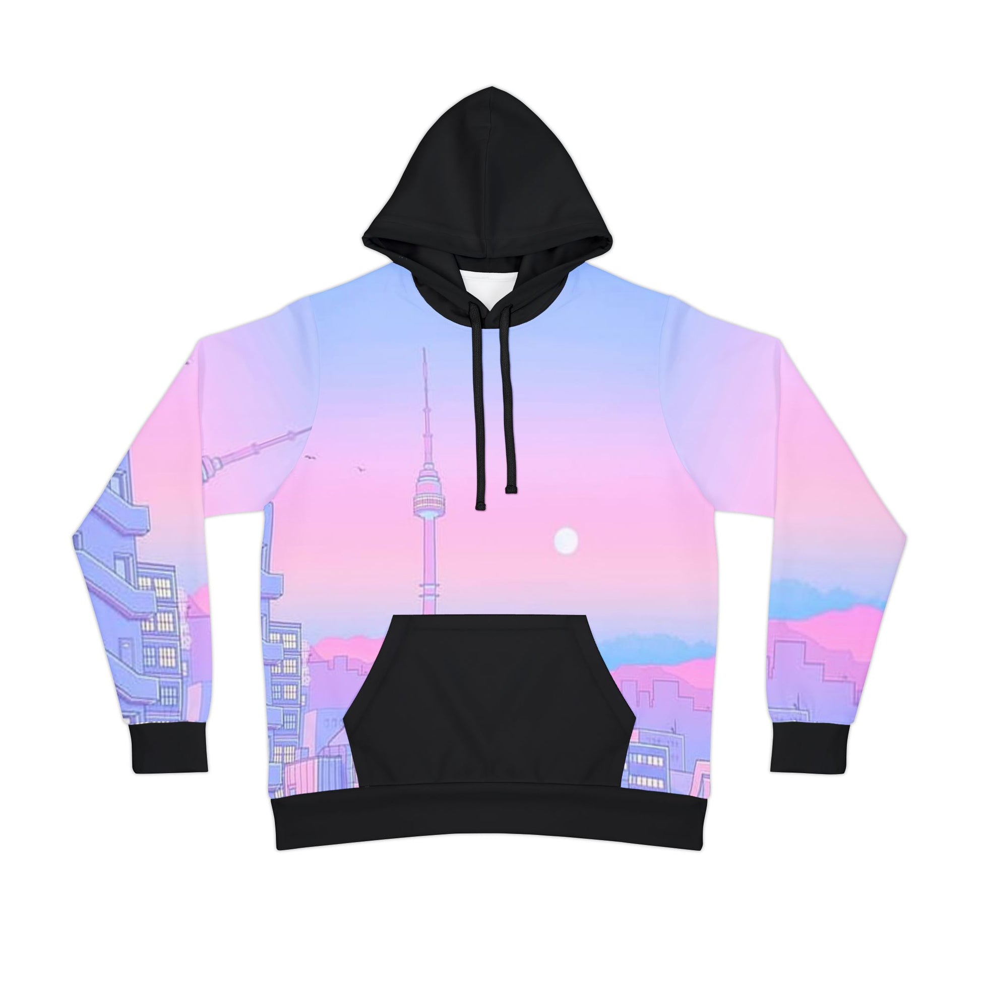 This hoodie wraps you in a slow, blush-toned city dusk — the skyline melts from cotton-candy pinks to soft lavender blues as if the sun is lingering on the horizon. Lightweight, stretchy fabric keeps movement easy whether you're strolling neon-lit streets or lounging at home. The roomy hood and black drawstrings frame your face, while a contrast black kangaroo pocket and waistband ground the dreamy print with practical, everyday wearability. Little details like the sewn care label and custom waistband tag make it feel thoughtfully made, not mass-produced. Wear it when you want to carry that quiet evening energy: mellow, nostalgic, and quietly bold.