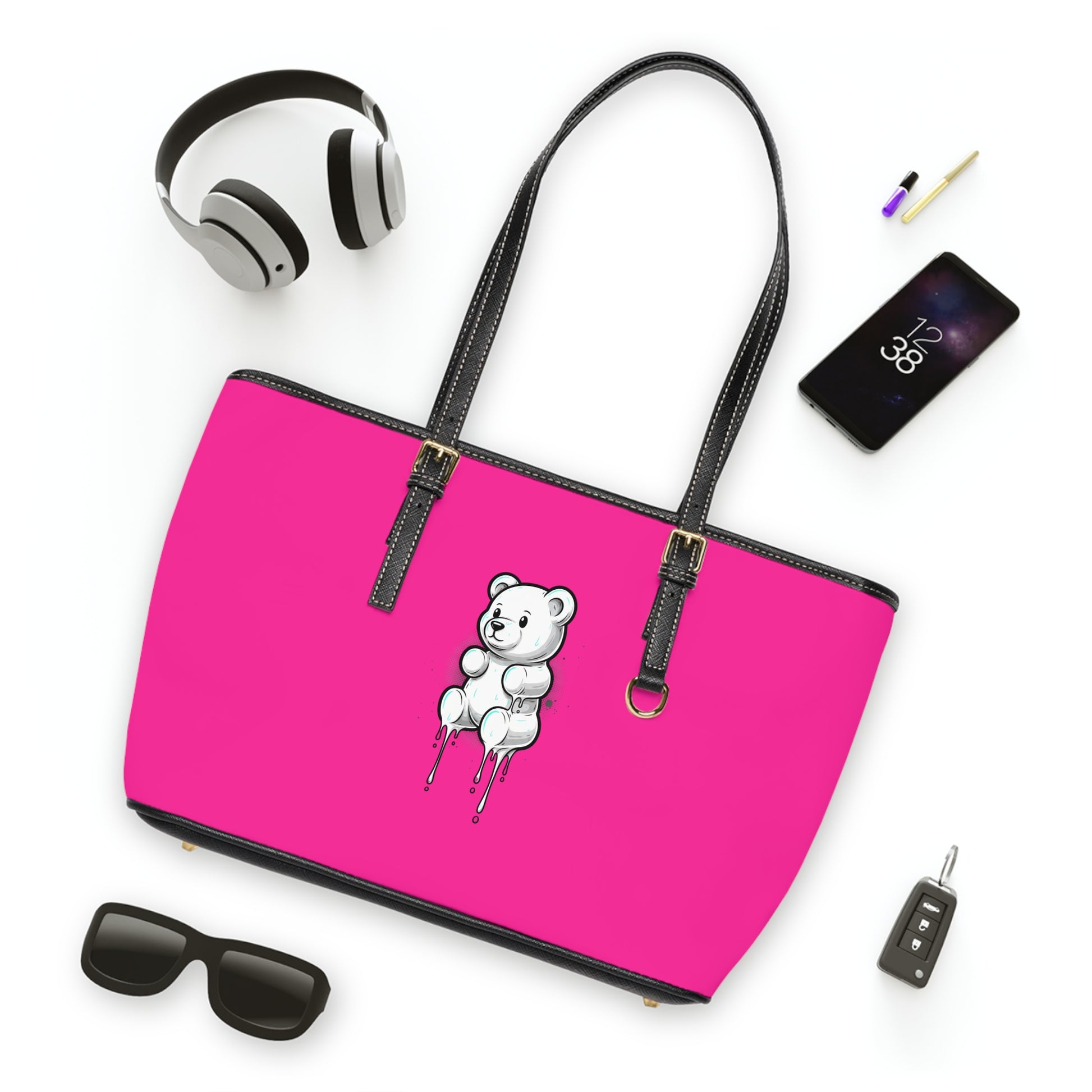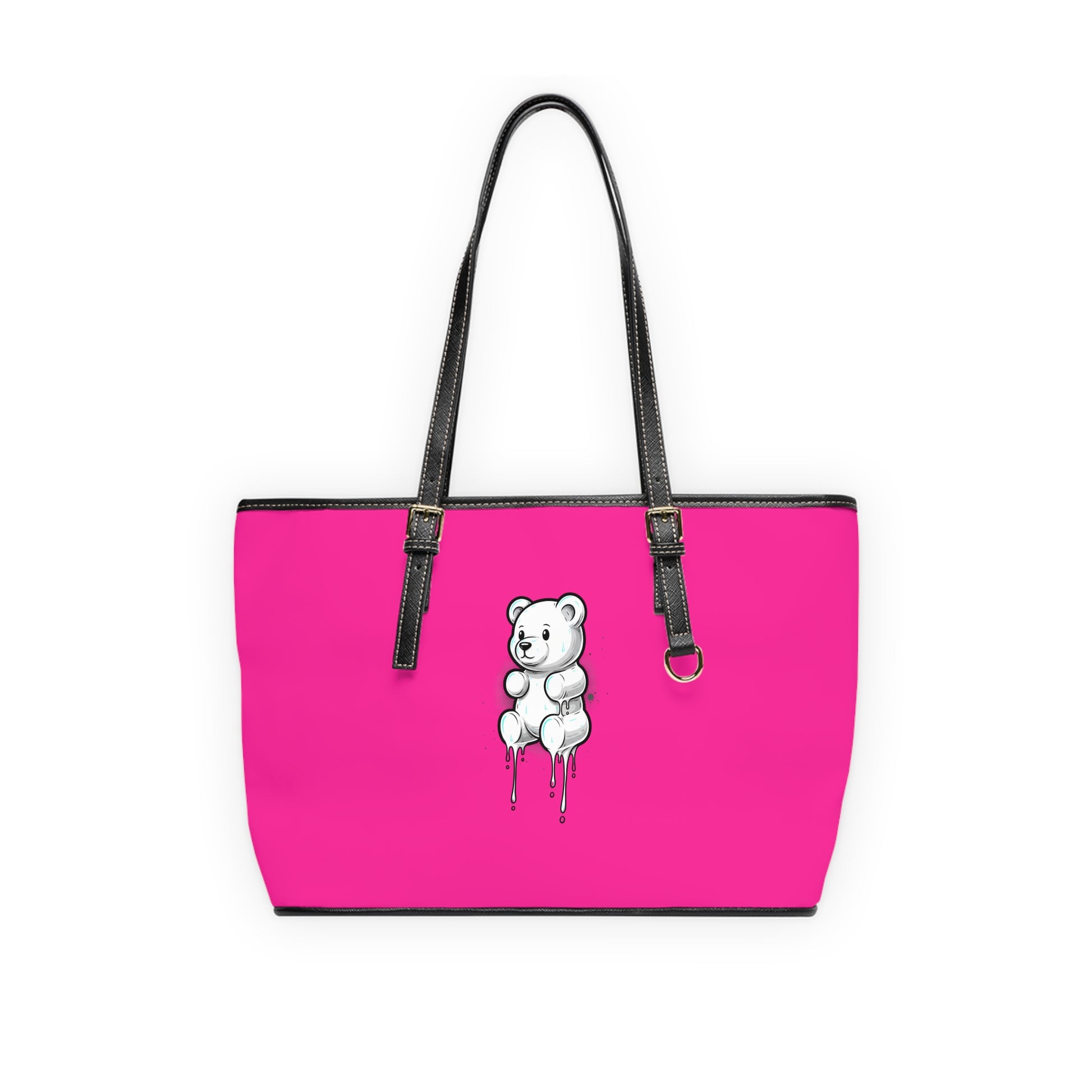 Pink PU Tote Bag with Melting Teddy Bear Graphic — Cute Streetwear Shoulder Bag